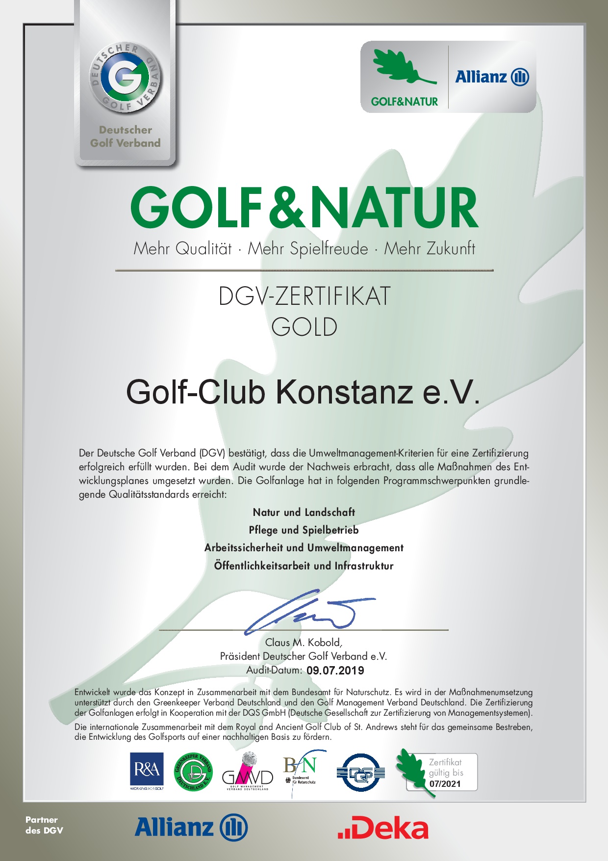 Golf-Club Konstanz e.V. bekommt Golf & Natur Zertifikat in Gold für weitere 3 Jahre.