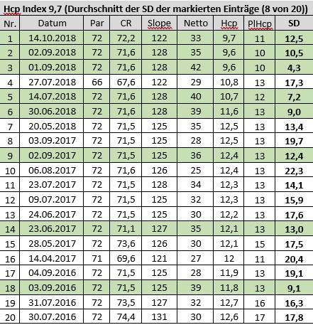 Ein Spieler befindet sich noch in der Phase, in der seine Spielstärke sich verbessert. Seine acht besten Ergebnisse bestehen aus Unterspielungen und Ergebnissen im Bereich seines Handicap Index (in diesem Beispiel farbig markiert). Da die schlechteren Ergebnisse die Berechnung des Handicap Index nicht beeinflussen, kann der Spieler davon ausgehen, dass die schlechten Ergebnisse wie zum Beispiel in den Zeilen 8, 10, 16 und 17 für ihn niemals handicaprelevant werden sein.