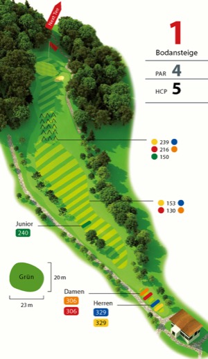 Schon am Abschlag ist für den Spieler zu erkennen, was ihn erwartet. Hoch droben im Wald auf einem Plateau befindet sich das Grün von Wald umschlossen. Rechts, nur durch eine Baumreihe vom Fairway abgegrenzt, die Driving Range. Erfreulicherweise ist keine Ausgrenze vorhanden. Jedes Loch trägt außer der obligaten Ziffer einen individuellen Namen. Bei der „Bodansteige“ geht es nach einem weiten und ebenen Fairway steil hinauf zum Grün, das auf der rechten Seite von einem Bunker bewacht wird. Ist der Abschlag, den man tunlichst auf die linke Waldseite zielen sollte, lang genug, so verbleiben noch 120 m zum Grün. Beim Schlag bergauf empfiehlt es sich, mindestens eine Schlägerlänge mehr zu nehmen, um das Grün sicher zu erreichen. Gerade sein ist beim zweiten Schlag alles, denn links und rechts lauert der Wald. (HCP 5)