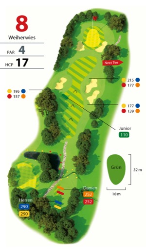 „Weiherwies“, das ist ein extrem kurzes Par 4, bei dem der Longhitter die Hoffnung haben kann, das Grün auf Chipdistanz zu driven. Über einen Teich geht es auf ein augenscheinlich breites Fairway. Doch es ist Vorsicht angesagt, denn allein drei Fairwaybunker, von denen sich zwei auf der rechten Seite befinden, erschweren diese Spielbahn. Das Grün ist von zwei Grünbunkern bewacht. Der kleine Frontbunker musste der Erweiterung der beiden Sandhindernisse seitlich weichen, die nun deutlich frischer und mit modernem Anstrich daherkommen. Wer das Risiko scheut, schlägt hier besser mit einem langen Eisen oder dem Holz 5 ab, um dann aus hundert Metern das Grün mit dem Eisen 9 oder dem Wedge anzuspielen. Auf jeden Fall ein Parloch, wenn der Abschlag auf dem Fairway liegt. Mit 32 m ist das Grün sehr lang; es gilt, den Ball recht nahe der Fahne zu platzieren, um am Ende nicht doch mit einem Dreiput das Grün zu verlassen. (HCP 17)