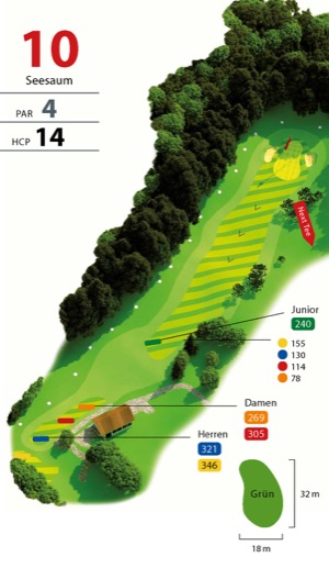 „Seesaum“, so der Name der Spielbahn, ist wörtlich zu nehmen, denn es bietet sich ein wunderschöner Blick über den Bodensee. Für den Abschlag an diesem Dogleg nach links empfiehlt sich ein Draw, der, wenn er lang genug ist, in Höhe der 100 m-Marke zu liegen kommt. Von hier aus ist es nur noch ein kurzes Eisen zum Grün. Neben den beiden Bunkern lauert jedoch noch eine Ausgrenze dicht am Grün. Wer mit dem Abschlag zu weit rechts ist, findet sich in einer Obstbaumwiese wieder, die das direkte Anspielen des Grüns fast unmöglich macht. Ist der zweite Schlag gelungen, lassen Sie ihren Wagen am Abschlag der 11 stehen und nehmen lediglich den Putter mit. (HCP 14)