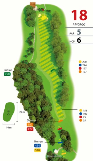 Zwei Par 5 am Ende einer Runde ist ungewöhnlich, bietet aber die Möglichkeit, den Score zu verbessern. Das „Kargegg“ ist zwar ein Par 5 wie die 17, aber wesentlich länger. Wenigstens empfindet der Spieler das so, obwohl es nur 34 m sind. Über Obstbaumwiesen geht es zurück zum Clubhaus. Das Fairway ist wellig und man tut gut daran zu überlegen, wohin man den Ball platziert, um nicht einen unangenehmen Schlag bergab machen zu müssen. Für den Durchschnittsspieler wird die Distanz für den dritten Schlag 150 m oder mehr betragen. Da sich das Fairway zum Grün hin stark verjüngt, empfiehlt es sich nur vorzulegen, um mit einem kurzen Pitch die Fahne zu attackieren. Wer allerdings die Bunker, es gibt davon zwei links und rechts vom Grün, nicht fürchtet, kann sein Glück auch mit einem langen Schlag versuchen. (HCP 6)