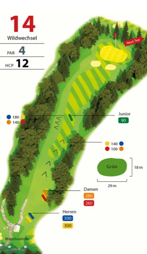 Die 14, der „Wildwechsel“, ist ebenfalls eine lösbare Aufgabe. Ein kurzes Par 4, bei dem man mit dem Drive die 100 m-Marke erreichen kann. Man sollte auf die linke Waldkante zielen, der Ball rollt dann auf dem leicht abschüssigen Gelände in die Fairwaymitte. Anderenfalls verschwindet der Ball im Rough oder angrenzenden Fichtenwald und ein Extraschlag verschlechtert den Score. Ein Schlag mit dem kurzen Eisen, das die beiden frontalen Grünbunker überfliegt, zwei Putts, und schon verlässt man dieses Grün mit einem Par und kann den Waldspaziergang befriedigt fortsetzen. (HCP 12)